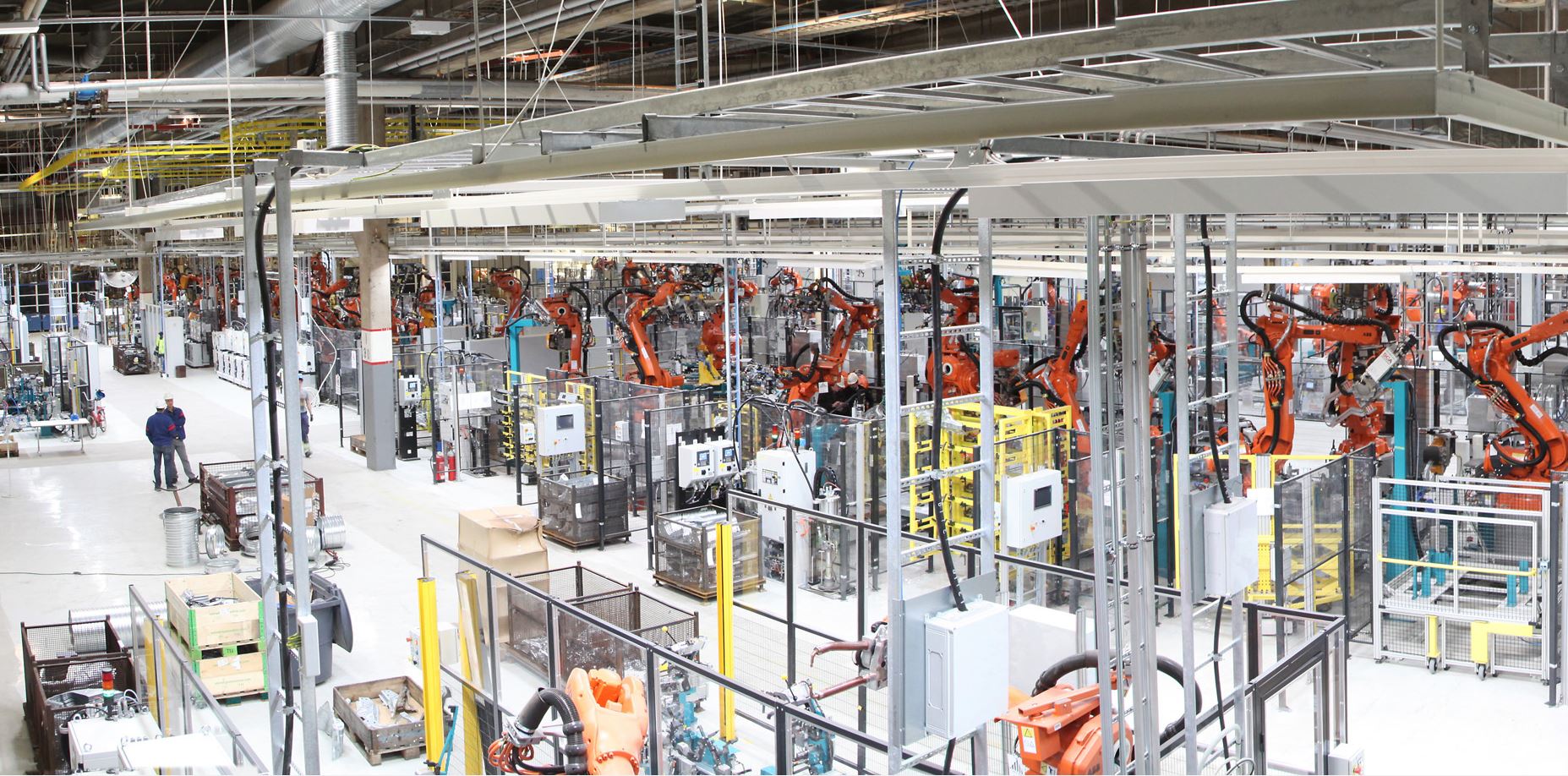 Robots working on a car chassis